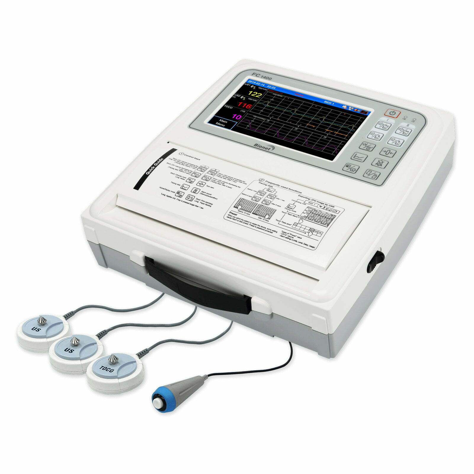FC 1400 este un monitor pentru făt geamăn, cu ecran LCD color de 7″, complet tactil. Vizualizarea dublă detectează și afișează inima fătului geamăn, ratele și activitatea uterină în timp real pe monitorul LCD color. Funcția de analiză: CTG – Cardio Toco Gram. Interfața tactilă, împreună cu 10 taste inteligente pentru 16 funcții, fac operarea mai ușoară și mai rapidă. Fabricat in Korea.