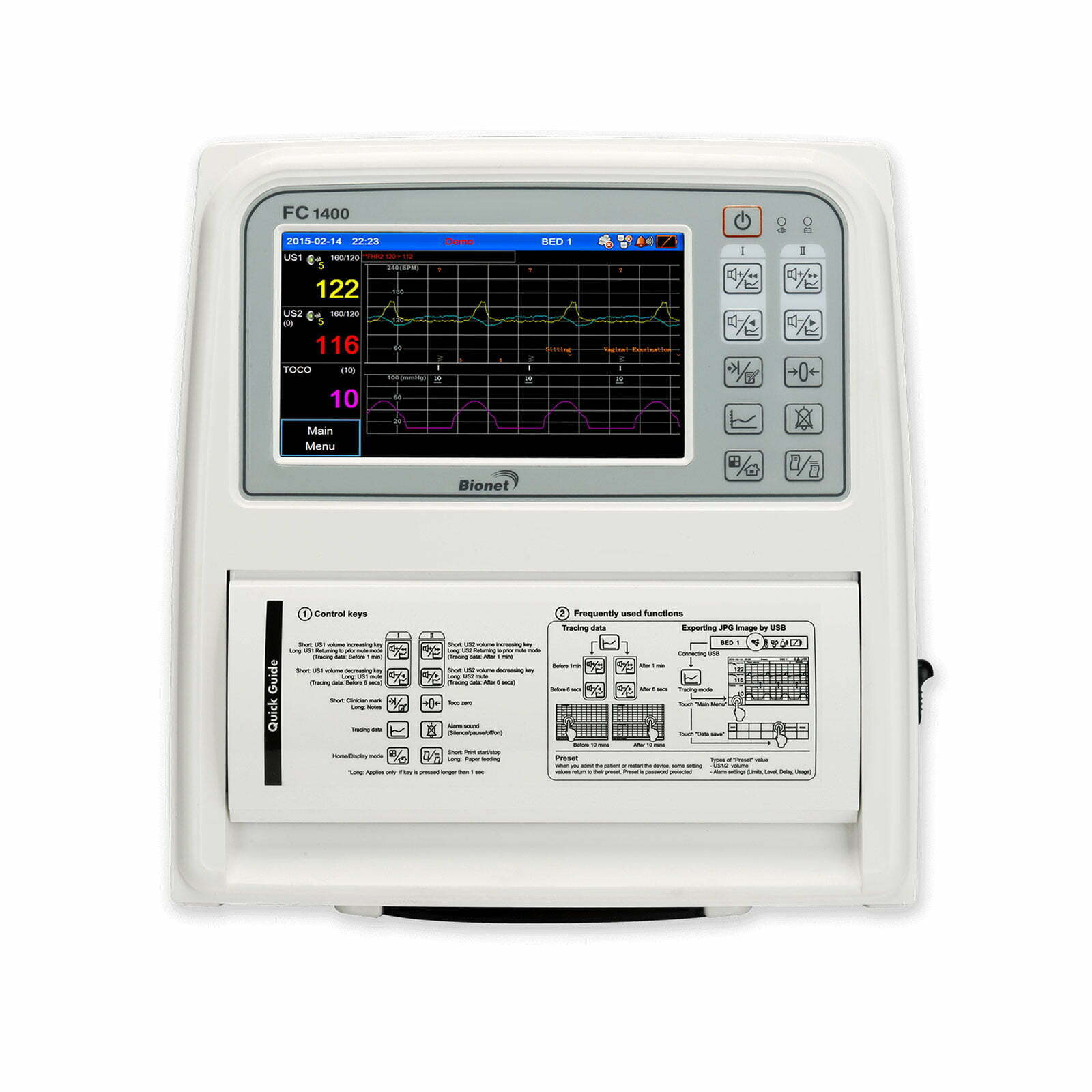 Imprimanta încorporată oferă o imprimare de dimensiune B4 ușor de citit pentru diagrame. Memoria integrată vă permite să revizuiți și să imprimați până la 72 de ore de date stocate intern. Interfața unității flash USB oferă o modalitate simplă de a muta rezultatul testului pe computer pentru atașarea EMR. Detectarea automată a mișcării fetale și reducerea la zero a TOCO reduc nevoia de implicare a personalului. Interpretarea CTG (Cardiotocografie) oferă recomandarea silentioasă pentru NST (non-stress test). FC 1400 oferă măsurători obstetricale precise și continue în cele mai riguroase medii clinice.