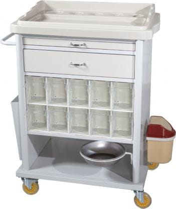 Troliu de urgenta si medicatie fabricat din metal cu sertare si compartimente de medicamente.