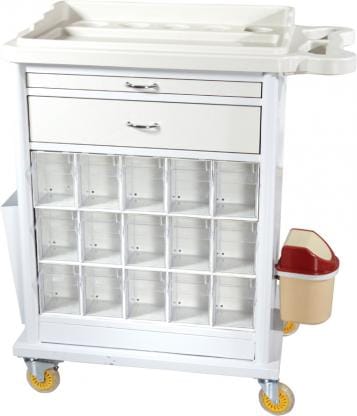Troliu de urgente si medicatie fabricat din metal cu sertare si compartimente de medicamente.