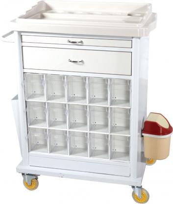 Troliu de urgente si medicatie cu cadru din metal, sertare si compartimente pentru medicamente.